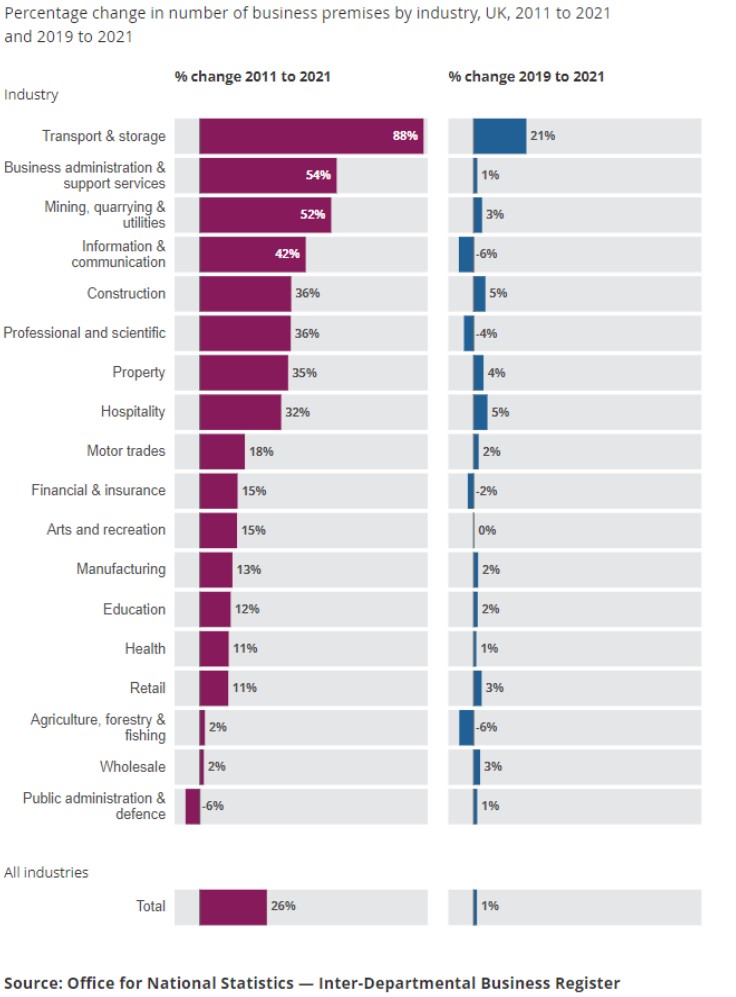 In April 2022 the ONS published a report entitled “The rise of the UK warehouse and the golden logistics triangle” which identifies that the number of premises used for B8 storage and distribution uses has almost doubled in the last decade, with this rise accelerating in the last two years due to Brexit and the COVID-19 pandemic.
